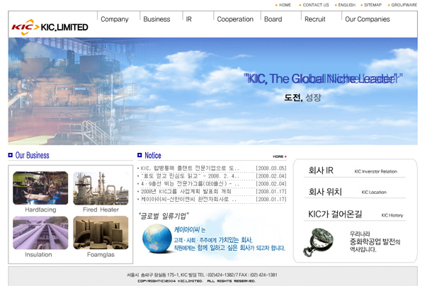 기업 | (주)케이아이씨 페이지 정보 글쓴이 관리자 작성일2008-09-08 19:40 조회10,287회 댓글0건 이전글 다음글 목록 본문 (주)케이아이씨 그룹이 글로벌 기업으로 성장하면서 리뉴얼 작업 및 아이덴티티 구축을 하게 되었다. 이번에 개편될 웹사이트는 글로벌 니치기업 이미지로 변환하는 중요한 시점이다. 이전글 다음글 목록