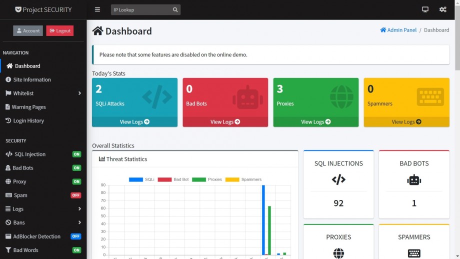 모든 로그를 볼 수 있는 강력한 관리 패널과 함께 제공되며, 금지되는 방문자(IP 주소), 국가, IP 범위, ISP(인터넷 서비스 공급자),